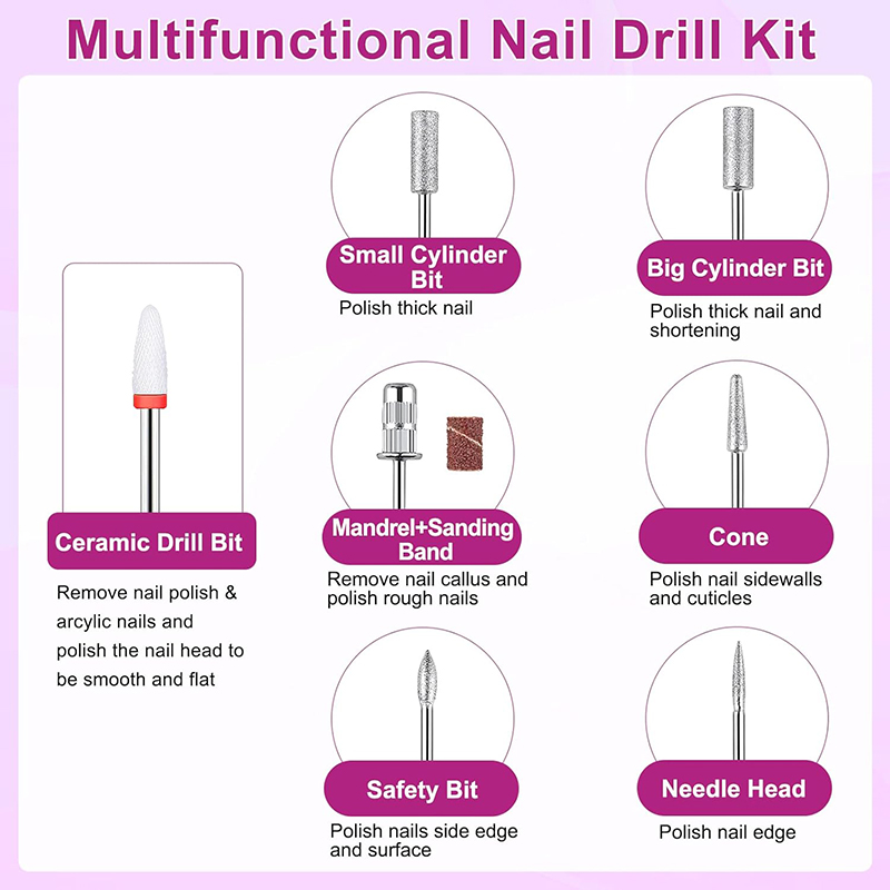 Το μηχάνημα τρυπάνι νυχιών περιλαμβάνει 6 τρυπάνια καρφιών από ανοξείδωτο χάλυβα, 1 τρυπάνι κεραμικής και 36 εναλλάξιμες λωρίδες λείανσης. Το κιτ μανικιούρ πεντικιούρ μπορεί να χρησιμοποιηθεί για μανικιούρ, πεντικιούρ, γυάλισμα, διαμόρφωση, λείανση επιδερμίδας, αφαίρεση νυχιών με ακρυλικό/τζελ ή για ομορφιά νυχιών. Ολοκληρωμένο με αξεσουάρ και εύκολο στη χρήση, ιδανικό για αρχάριους στα νύχια!