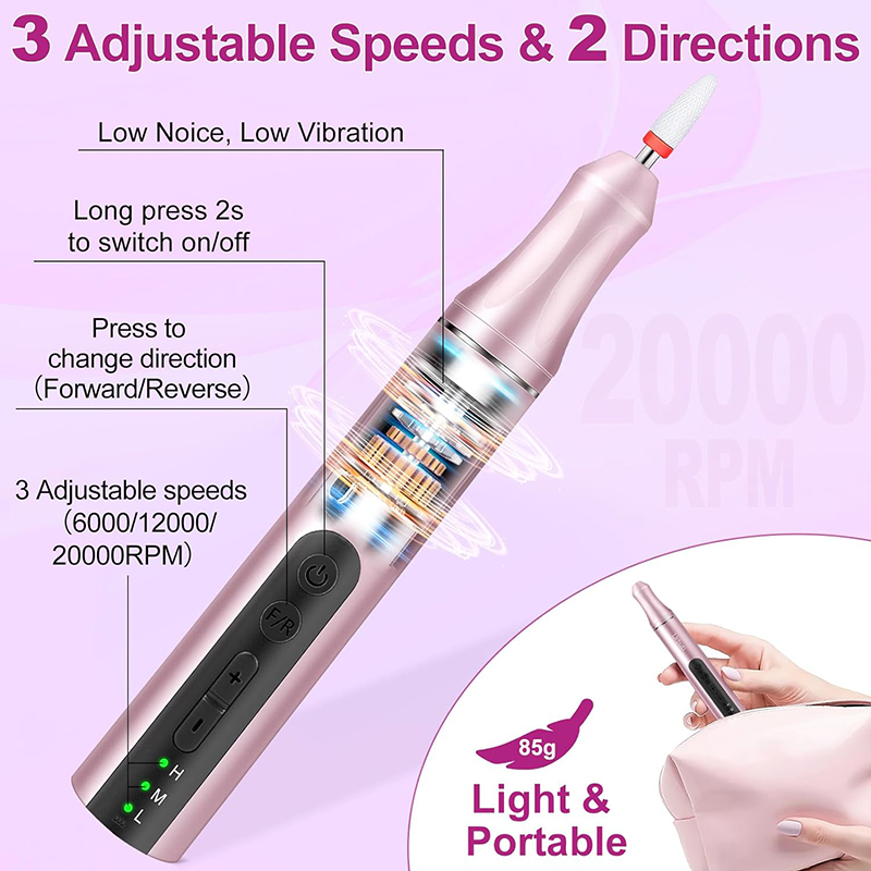 Οι λίμες νυχιών Professional έχει σχεδιαστεί με 3 ταχύτητες 6000-12000-20000, απλώς πατήστε σύντομα το κουμπί + ή - για να αυξήσετε ή να μειώσετε την ταχύτητα. Εύκολη ρύθμιση της ταχύτητας και εξοικονόμηση χρόνου όταν ακονίζετε τα νύχια. Η κατεύθυνση του τρυπανιού μπορεί να αλλάξει εύκολα με το πάτημα του κουμπιού F/R, ιδανικό για αριστερόχειρες, μάστορες nail artists ή αρχάριους για την περιποίηση νυχιών.