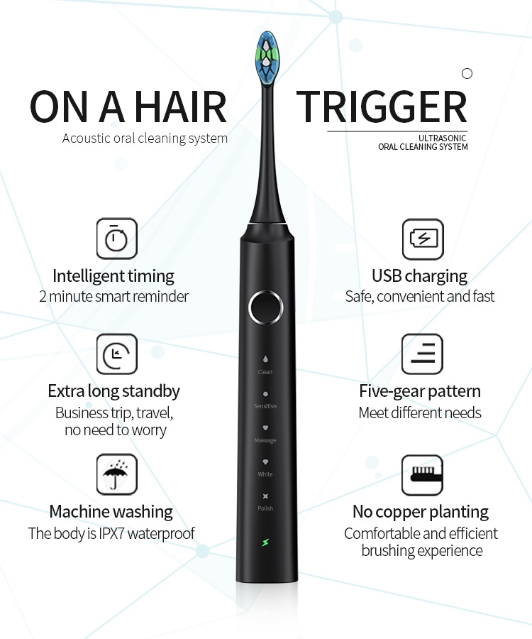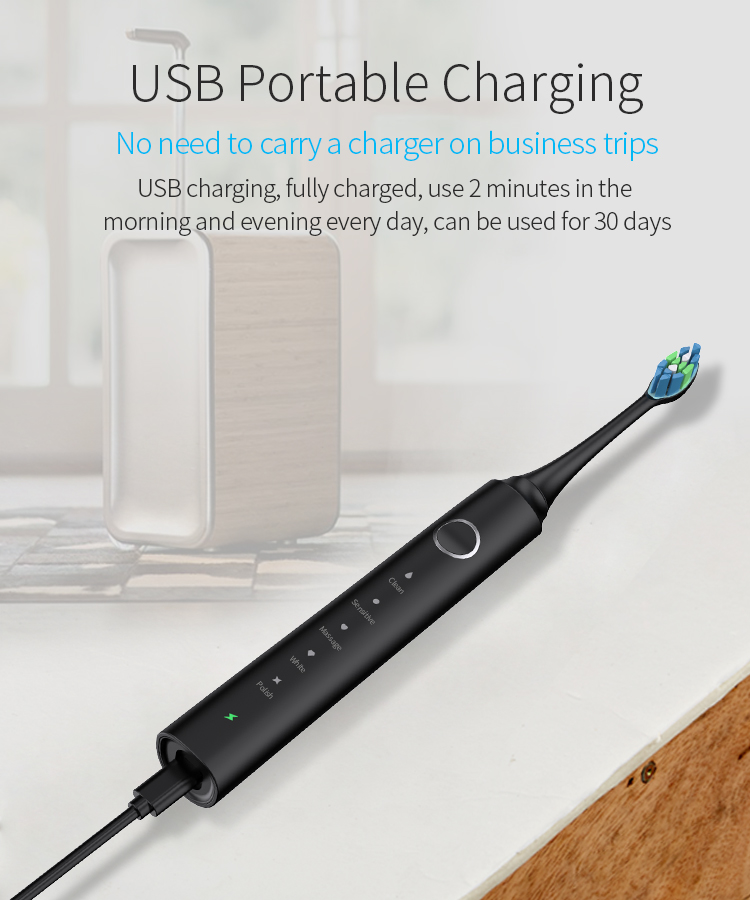 - 5 ΛΕΙΤΟΥΡΓΙΕΣ ΒΟΥΡΤΣΙΣΜΟΥ ΥΨΗΛΗΣ ΑΠΟΔΟΣΗΣ- Καθαρό (απαλό), Λευκό (ισχυρό), Πολωνικό (ισχυρή ανεστραμμένη συχνότητα), Πιο ήπιο (ήπια συχνότητα αναστροφής) και Ευαίσθητο (μαλακό) για να ταιριάζει σε διαφορετικές συνθήκες των δοντιών των ούλων, ώστε να μπορείτε να επιλέξετε διαφορετικούς τρόπους λειτουργίας σύμφωνα με τις προτιμήσεις σας και τις συστάσεις του οδοντιάτρου.