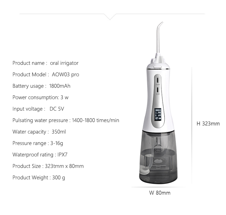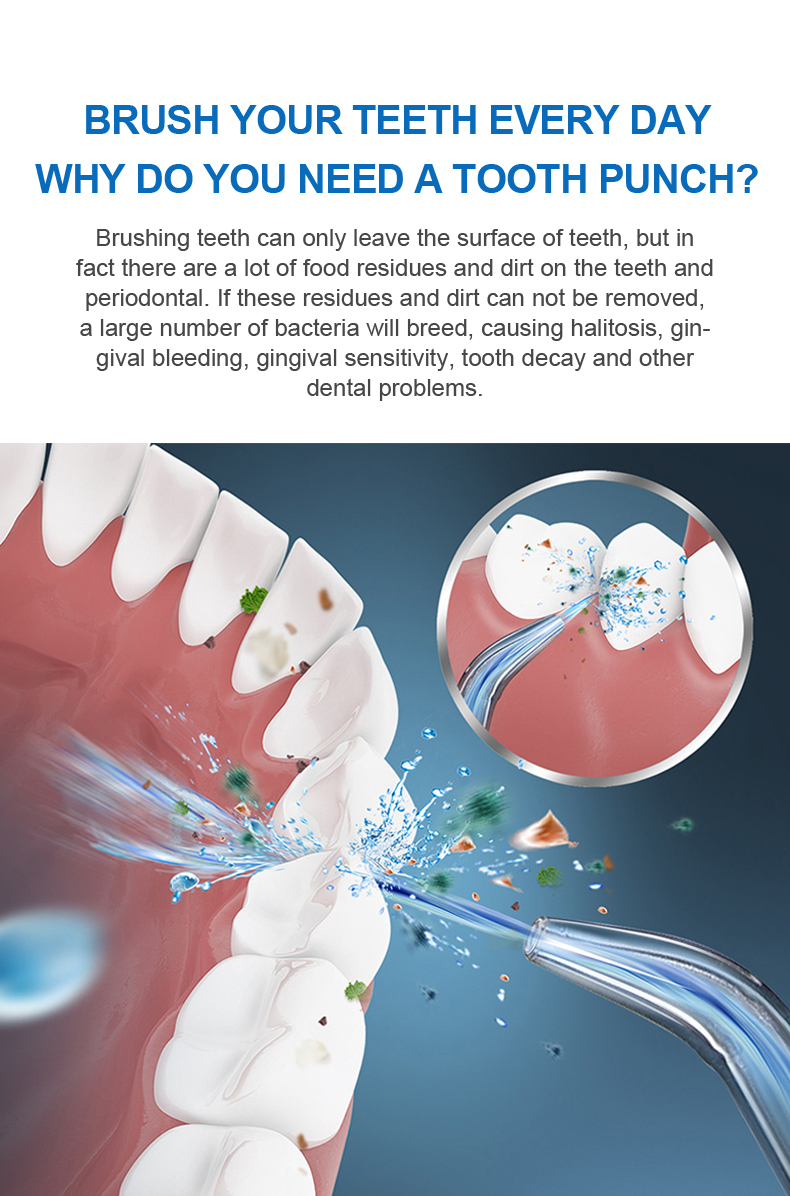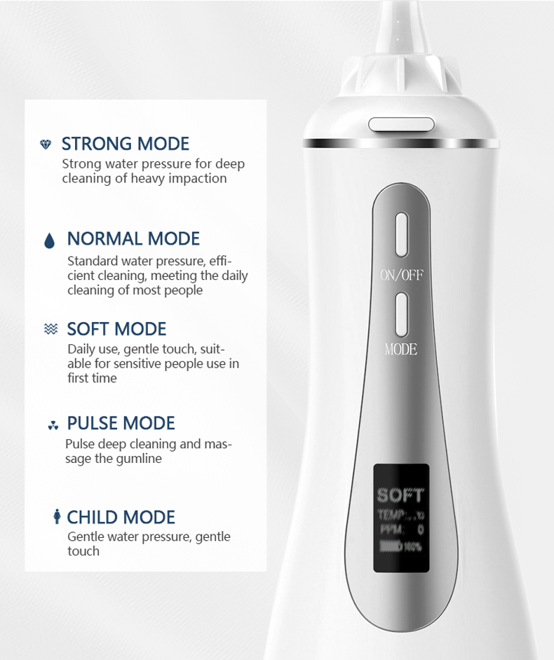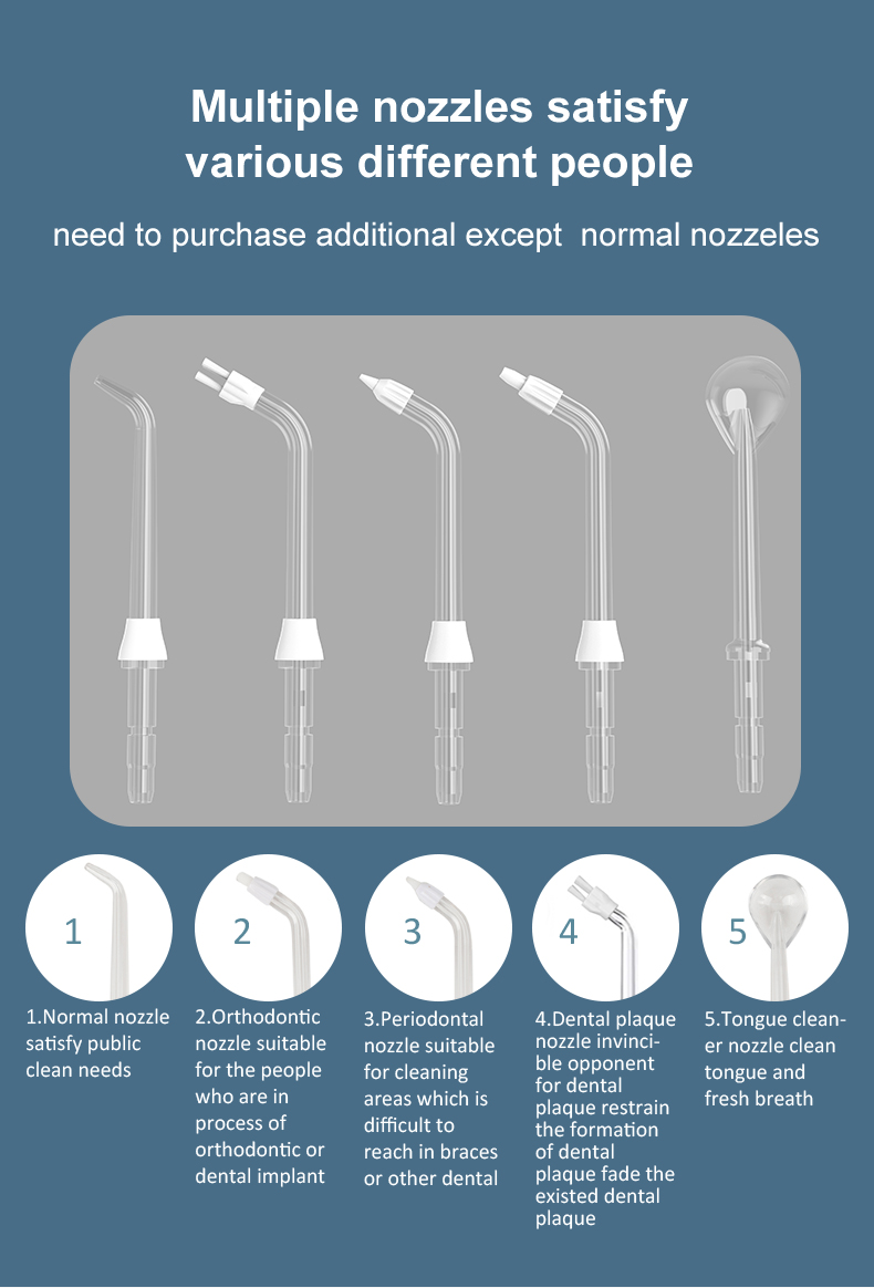 Αυτή η οδοντική επιλογή νερού παρέχει παλμούς υψηλής πίεσης νερού στις 1400-1800 φορές το λεπτό, αφαιρώντας αποτελεσματικά το 99,9% της οδοντικής πλάκας για βαθύ καθαρισμό των δοντιών. Αυτό το υδάτινο οδοντικό μασάζ κάνει μασάζ στα ούλα, προάγει την κυκλοφορία του αίματος και αντιμετωπίζει στοματικά προβλήματα όπως κακή αναπνοή, ορθοδοντικά δόντια