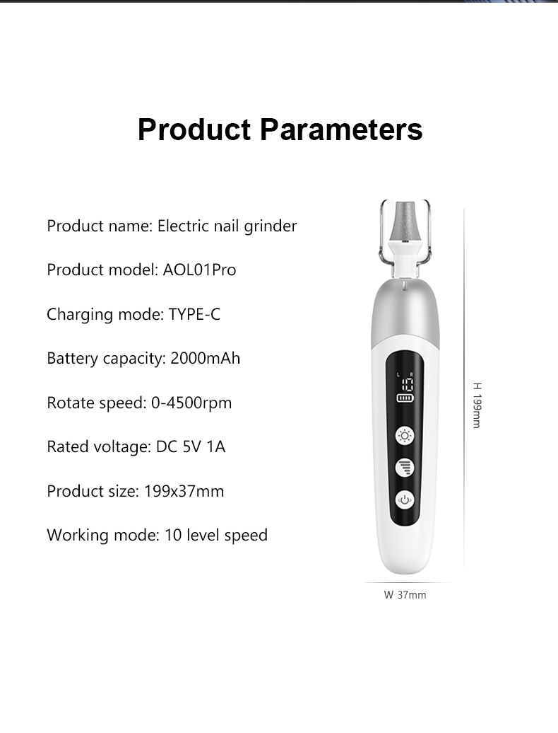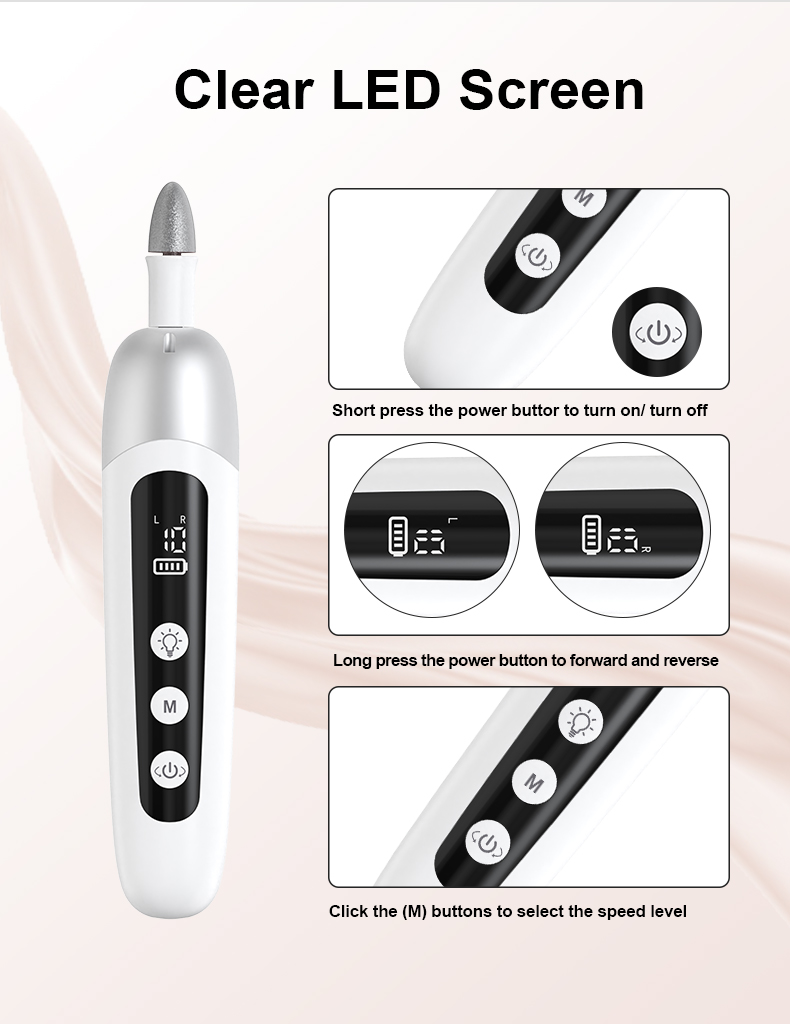 - ΚΑΙΝΟΤΟΜΙΚΗ ΟΘΟΝΗ LED: Πλοηγηθείτε απρόσκοπτα στις επιθυμητές ρυθμίσεις με ευκολία. Η οθόνη LED υποδεικνύει την κατάσταση της μπαταρίας, τις προτιμήσεις ταχύτητας και τις ρυθμίσεις περιστροφής για αβίαστη λειτουργία. Η ηλεκτρική μηχανή λίμας νυχιών είναι επίσης εξοπλισμένη με ενσωματωμένο φως LED που φωτίζει περιοχές στα χέρια και τα πόδια