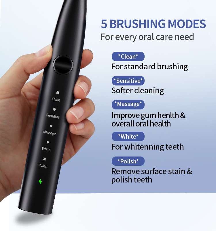 - 5 ΛΕΙΤΟΥΡΓΙΕΣ ΒΟΥΡΤΣΙΣΜΟΥ ΥΨΗΛΗΣ ΑΠΟΔΟΣΗΣ- Καθαρό (απαλό), Λευκό (ισχυρό), Πολωνικό (ισχυρή ανεστραμμένη συχνότητα), Πιο ήπιο (ήπια συχνότητα αναστροφής) και Ευαίσθητο (μαλακό) για να ταιριάζει σε διαφορετικές συνθήκες των δοντιών των ούλων, ώστε να μπορείτε να επιλέξετε διαφορετικούς τρόπους λειτουργίας σύμφωνα με τις προτιμήσεις σας και τις συστάσεις του οδοντιάτρου.